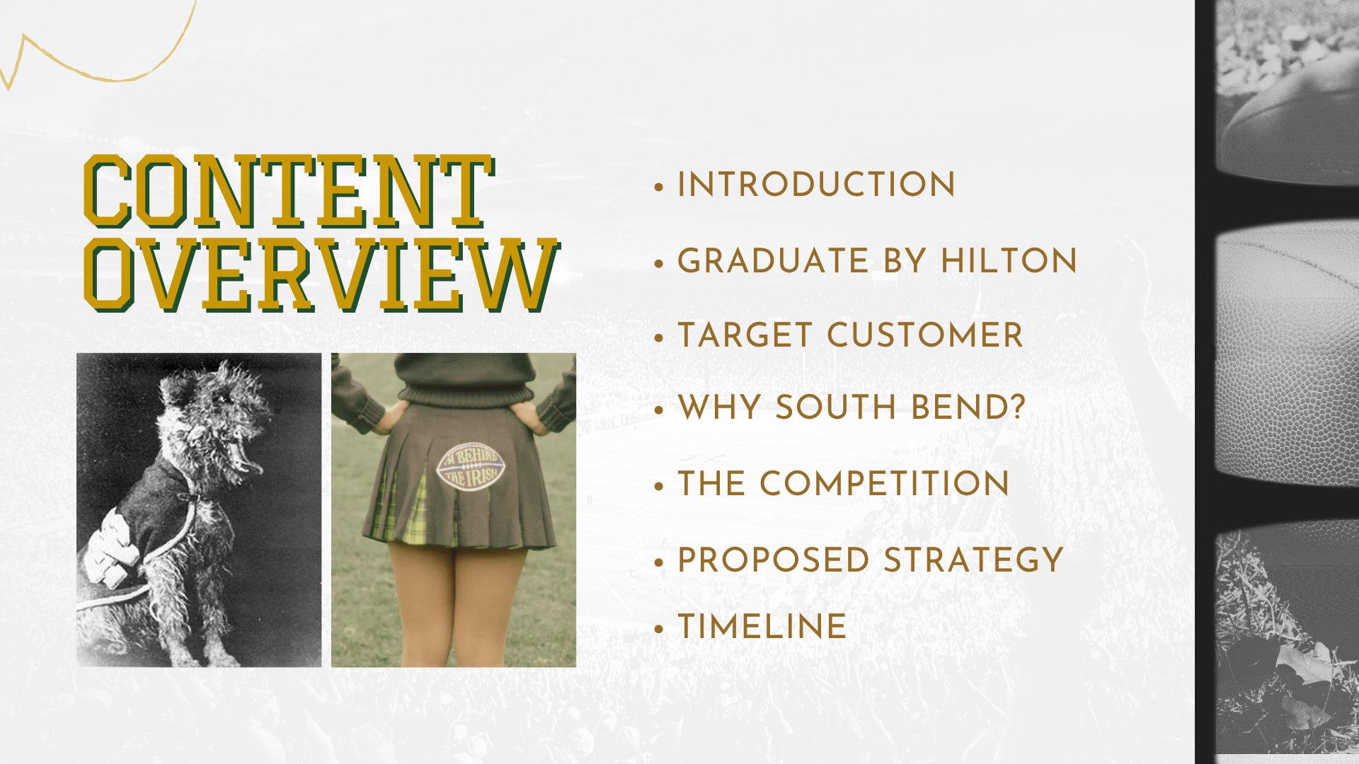 For this case study, I crafted a brand extension proposal for Graduate Hotels, reimagining how their signature collegiate-inspired hospitality could take root in South Bend. The project focused on aligning design, experience, and local culture to create a seamless addition to the brand’s portfolio.
